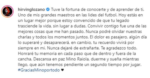 "Tuve la fortuna de conocerte y de aprender de ti. Uno de mis grandes maestros en las lides del futbol. Hoy estás en un lugar mejor porque estoy convencido de que tu legado trasciende la vida", dijo Lozano.