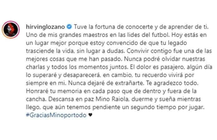 Unas horas más tarde el futbolista mexicano compartió un mensaje en sus redes sociales dedicado a Mino.