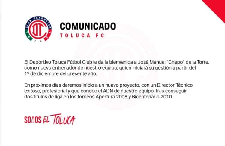 El equipo Toluca anunció este lunes a José Manuel "Chepo" de la Torre como su nuevo director técnico, tras la salida de Ricardo La Volpe, quien dejó a los Diablos Rojos el pasado 11 de noviembre.