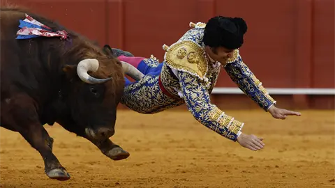 El diestro sevillano ha sido cogido cuando trataba de fijar con el capote al animal, de la ganadería de Hermanos García Jiménez, que se le ha venido al pecho, arrollándole y, en el intento de huida, le ha herido aparentemente en el glúteo izquierdo, en una cornada de la que se desconoce la extensión ni las posibles trayectorias.