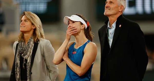 El presidente de la Federación de Tenis de Francia Gilles Moretton y la directora del torneo Amélie Muaresmo participaron en una ceremonia tras el duelo en la c ancha Philippe Chatrier.