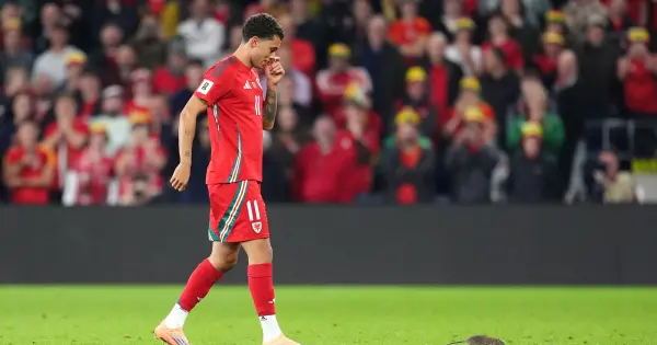 El delantero galés Brennan Johnson terminó ahuyentándolo por las líneas laterales mientras la multitud aplaudía.
