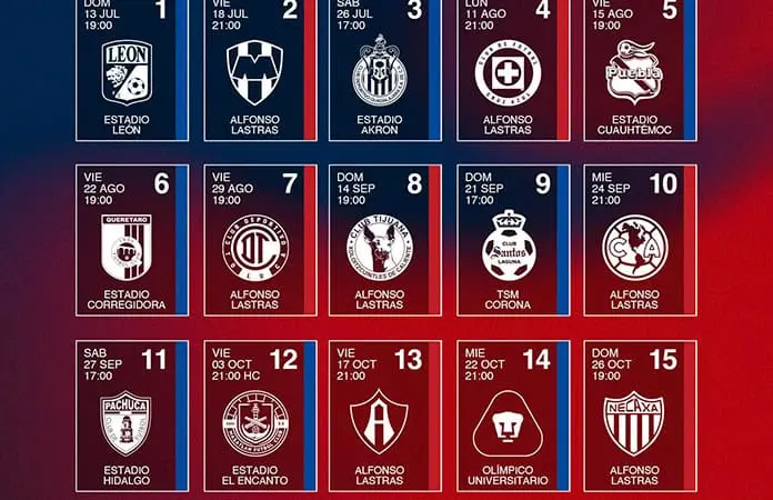 Otros partidos destacados en casa serán ante Toluca el 29 de agosto (jornada 7) y frente al Club América el 24 de septiembre (jornada 10).