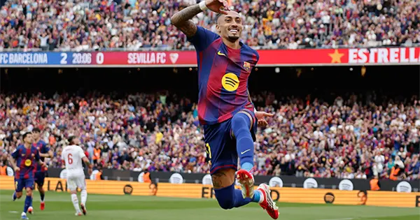 Oso recortó distancias para Sevilla antes del descanso y Raphinha completó su triplete tras el intermedio con un disparo que se desvió y superó al guardameta. Luego Cancelo le dio aún más brillo al triunfo, y Djibril Sow redujo la diferencia en el tiempo añadido.