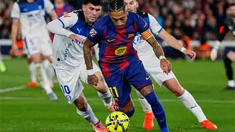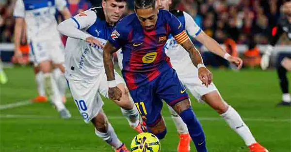 Raphinha desbordó dos veces a la defensa de Alavés por la banda izquierda el área antes de pasar el balón a Lamine y Olmo para que anotaran en dos ocasiones.