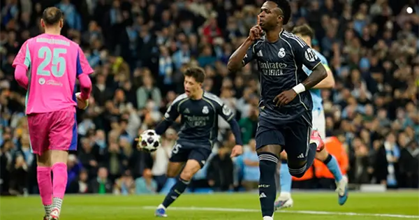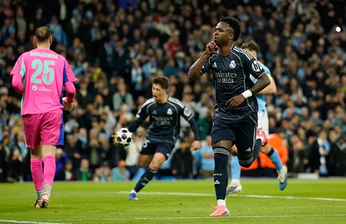 Al defender ventajas de tres goles tras el partido de ida, el Madrid emergió victorioso 2-1 en la cancha del City, ayudado por una temprana tarjeta roja a Bernardo Silva, el capitán del City, y un doblete de Vinicius Junior, para avanzar 5-1 en el global.