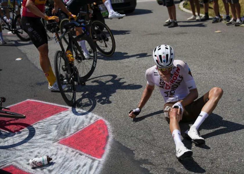 Un día después de que otro choque provocó que varios ciclistas abandonaran, el más reciente accidente ocurrió en el kilómetro 52 cuando un asistente tocó sin querer al estadounidense Sepp Kuss —compañero de Vingegaard— y lo derribó.