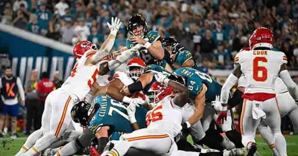 JACKSONVILLE, Florida.- Trevor Lawrence tropezó, se levantó y corrió para un touchdown de una yarda con 23 segundos restantes, convirtiendo un error risible en una anotación improbable, y los Jaguars de Jacksonville vencieron 31-28 a los Chiefs de Kansas City el lunes por la noche.