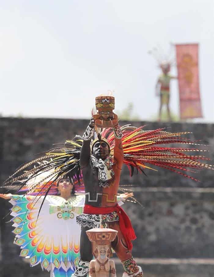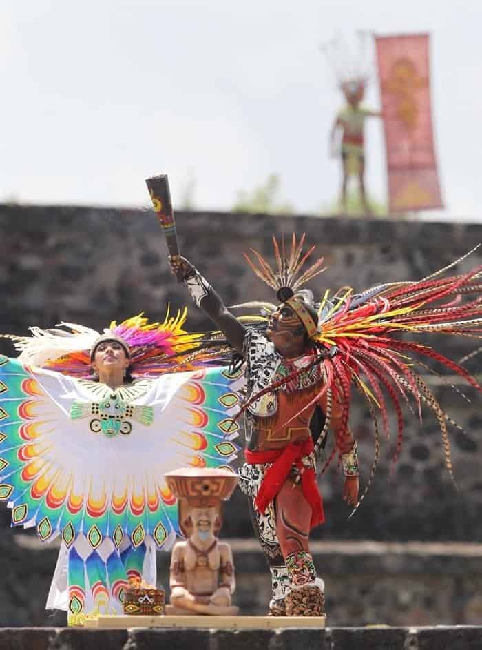 Luego empezó la ceremonia del encendido del Fuego Nuevo con la danza realizada por unas 300 personas de la Escuela de Bellas Artes del Estado de México, que lucieron sus coloridas vestimentas y penachos de plumas.