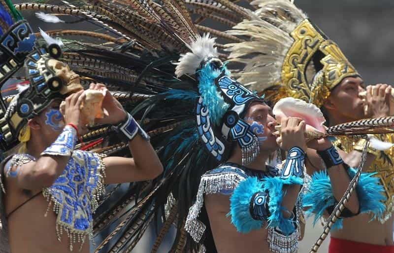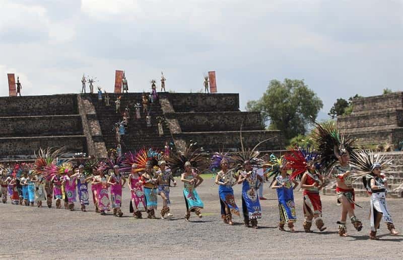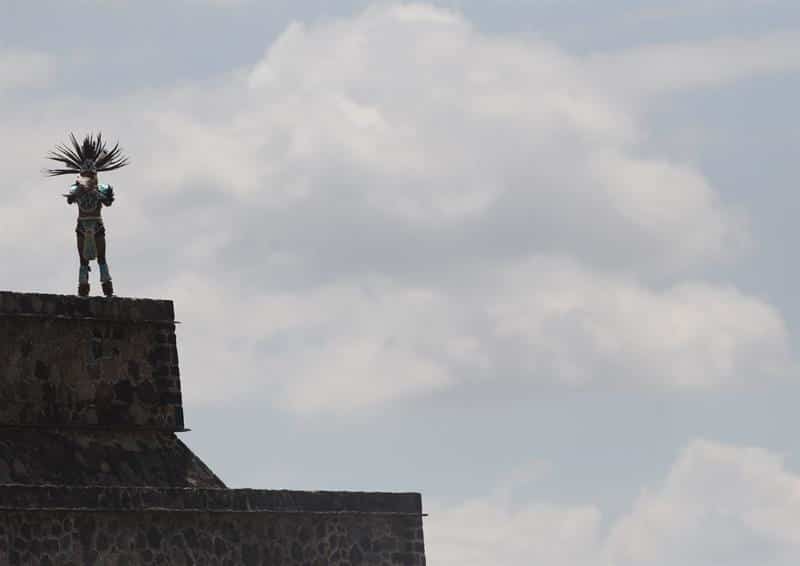 Además del sonido de tambores, flautas, sonajas y cascabeles amarrados en los tobillos de los danzantes, el de los caracoles emitidos por hombres parados en las edificaciones a la orilla de la Calzada de Los Muertos inundaron el espacio.