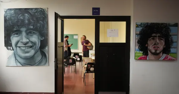 Pinturas que representan al fallecido astro del fútbol Diego Maradona se exhiben en la Facultad de Ciencias Sociales de la Universidad de Buenos Aires donde se celebra el congreso internacional en su honor, en Buenos Aires, Argentina, el jueves 6 de noviembre de 2025. (AP Foto/Natacha Pisarenko)