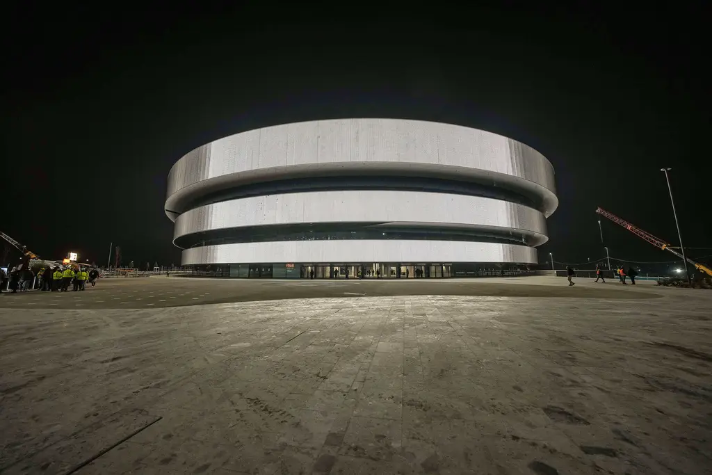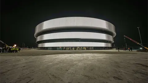 La pista de hielo está en su lugar y la mayoría de los asientos, pero todavía hay una abundancia de láminas de plástico, mientras que algunas áreas, como los vestuarios, están lejos de estar terminadas.
