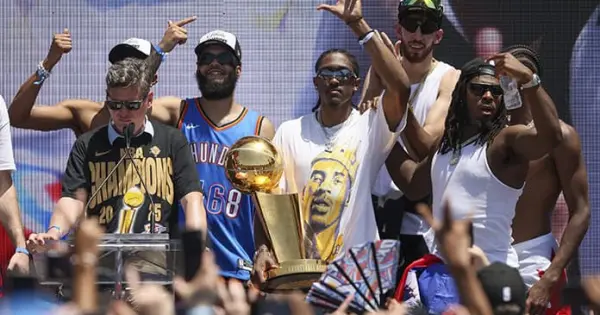 Algunos de los jugadores, como el ‘MVP’ de la temporada regular y de las Finales, el canadiense Shai Gilgeous-Alexander, bajaron del autobús en algunos tramos para compartir con sus hinchas el trofeo de la NBA.
