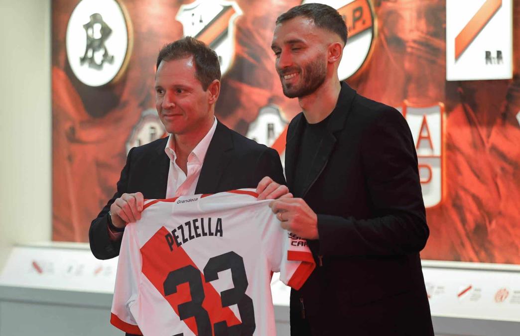 BUENOS AIRES (ARGENTINA).- El jugador argentino Germán Pezzella (d) posa con el presidente de River Plate, Jorge Brito, en la rueda de prensa de presentación de Pezzella como nuevo jugador del club este jueves, en el Museo del Club River Plate en Buenos Aires (Argentina). Pezzella dijo durante su presentación como nuevo jugador de River Plate que el flamante entrenador del equipo, Marcelo Gallardo, es "gran responsable" de su regreso al club tras nueve años en el fútbol europeo.