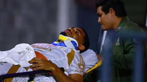 En las imágenes de la transmisión, se vio a Joaquim con la mirada perdida, producto del choque de su rostro con el hombro del arquero, quien estuvo a su lado hasta verlo retirarse en una ambulancia.