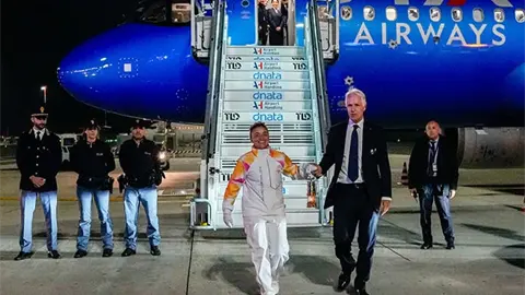 La tenista Jasmine Paolini —medallista olímpica de oro— y el presidente del comité organizador local, Giovanni Malagò, llevaron la llama fuera del avión.