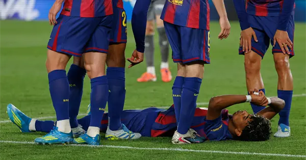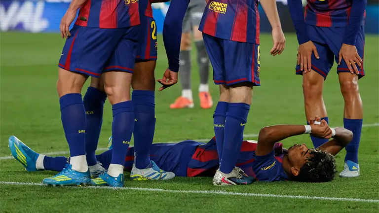Lamine anotó el primer gol del Barcelona a los 40 minutos e inmediatamente miró hacia el banquillo e indicó que estaba lesionado. Se dejó caer al suelo del estadio Nou Camp cuando sus compañeros llegaron para celebrar y luego pareció agarrarse la parte posterior de la pierna izquierda.