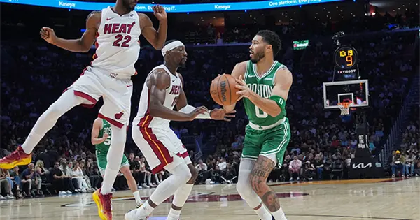MIAMI.- Jaylen Brown anotó 43 puntos, Jayson Tatum logró su primer triple-doble de la temporada y los Celtics de Boston se apoyaron en un primer cuarto récord para vencer el miércoles 147-129 al Heat de Miami.