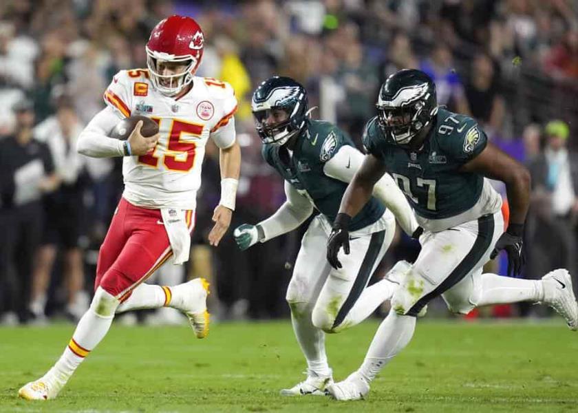 Abajo 24-14 luego de dos cuartos, Mahomes lanzó dos pases de touchdown en cuestión de tres minutos, a Kadarius Toney y Skyy Moore en jugadas idénticas, para capitalizar la remontada y poner a los Eagles en desventaja por primera vez en toda la postemporada.