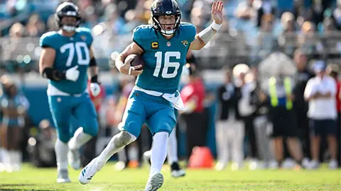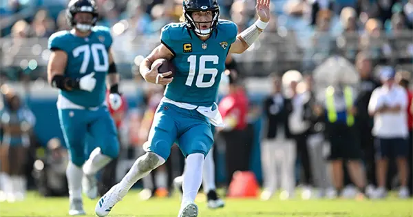También corrió para 51 yardas y un touchdown, una escapada de 15 yardas en el primer cuarto que ayudó a establecer el tono. Lawrence rodó hacia la izquierda, esquivó a Will McDonald en el backfield y luego corrió por la línea lateral.