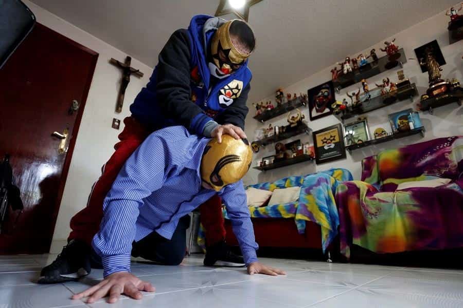 Aunque falta el cuadrilátero, con su 12 cuerdas y 36 metros cuadrados de lona, los luchadores mexicanos se las ingenian para "entrenar en casa" como lo hace Súper Muñeco.