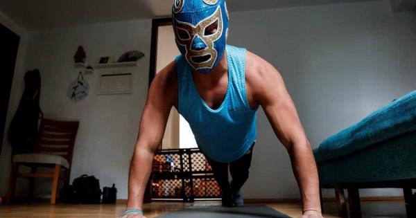 El reconocido gladiador Súper Muñeco, con 38 años como profesional, se coloca la máscara y ropa cómoda para comenzar una serie de ejercicios con los que se mantiene activo físicamente durante la cuarentena que ha confinado en sus casas a millones de personas en el mundo.