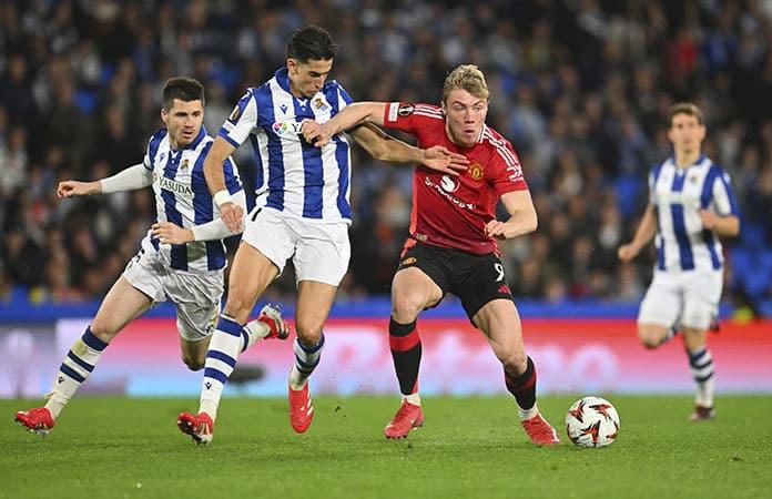 El club inglés se adelantó con un gol de Joshua Zirkzee a los 58 minutos, pero los anfitriones igualaron 12 minutos después mediante un penal tras una mano de Bruno Fernández. Mikel Oyarzabal ejecutó el remate, con el arquero Andre Onana lanzándose al lado opuesto.