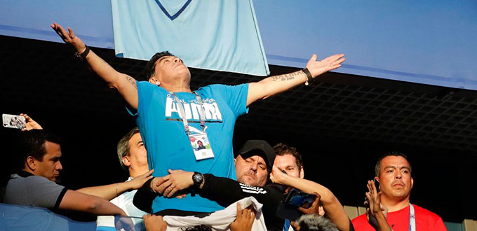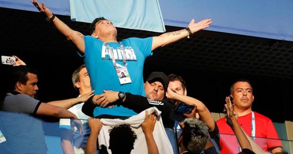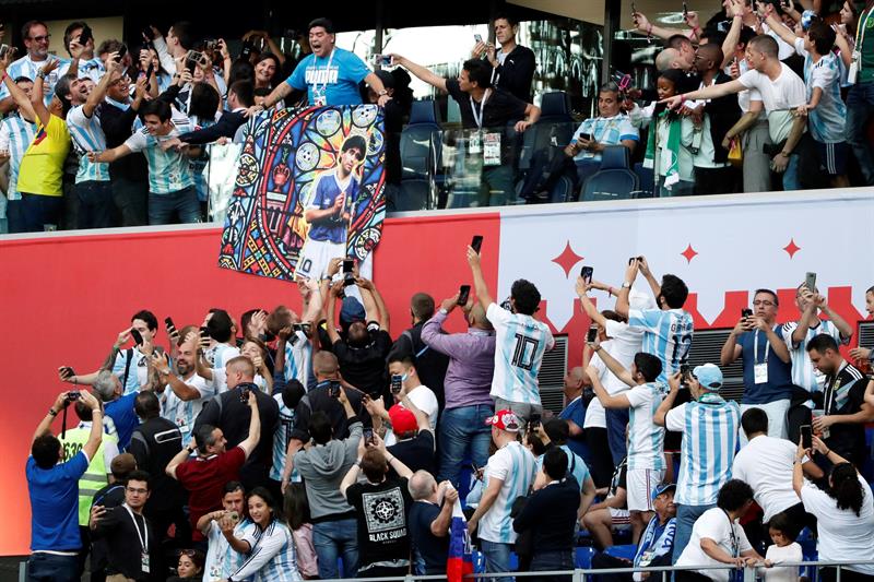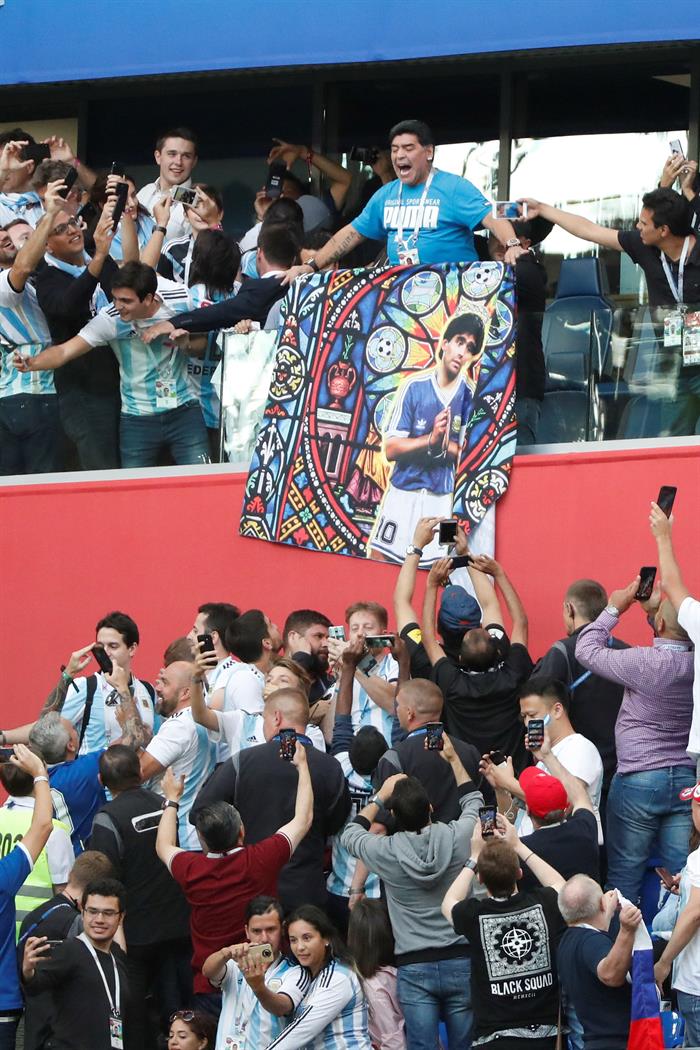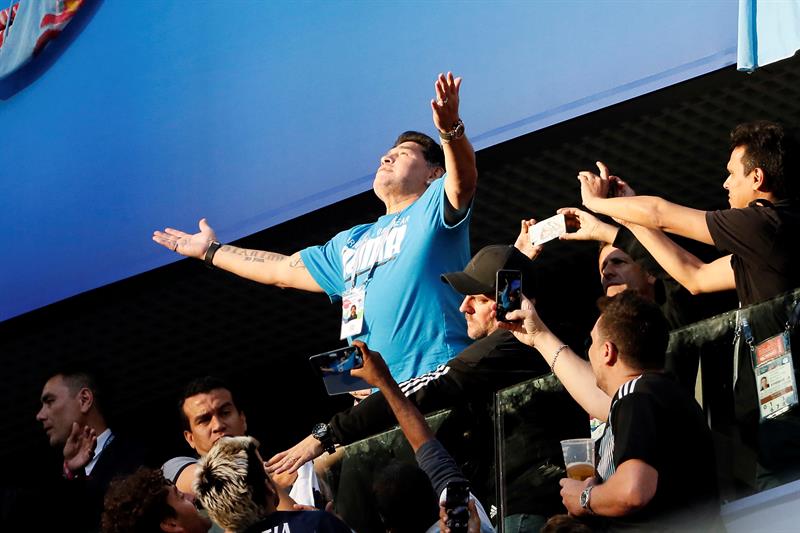 El exfutbolista y exselecionador argentino Diego Armando Maradona fue protagonista este martes durante el Nigeria-Argentina, en el que la Albiceleste logró el pase a los octavos de final del Mundial de Rusia 2018, por su actitud en uno de los palcos del estadio de San Petersburgo.
