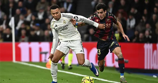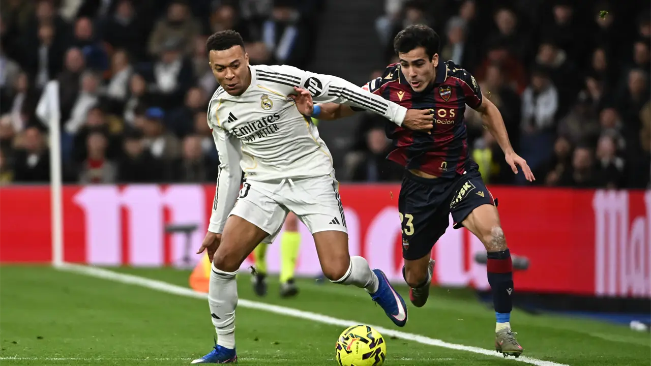 El Real Madrid se impuso este sábado al Levante (2-0) gracias a los goles del francés Kylian Mbappé, de penalti en el minuto 58, y de Raúl Asencio, de cabeza en el 66.