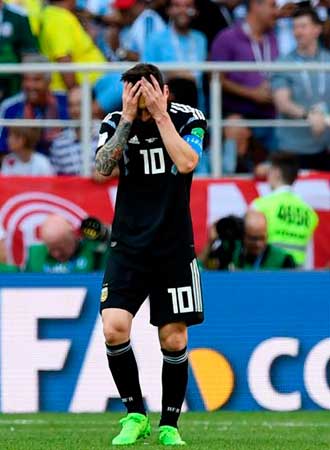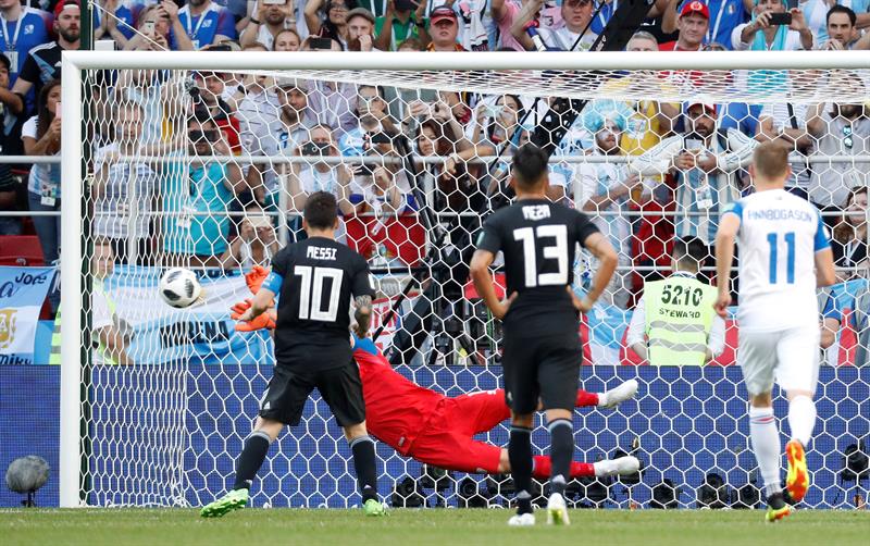 Messi malogró su cuarto penal con la casaca albiceleste a los 63 minutos: el arquero Hannes Halldorsson anticipó la dirección de su remate de zurda e impidió que Argentina tomara la ventaja. Fue justo el mismo día en que el astro del Barcelona igualó la marca de Diego Maradona de cuatro mundiales disputados.