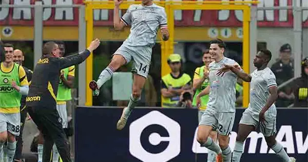 Nicolò Zaniolo fue la figura del Udinese en San Siro. Contraatacó desde muy adentro de su propio campo y resistió un par de entradas antes de abrir hacia la derecha para Arthur Atta, cuyo centro fue desviado hacia adentro por Davide Bartesaghi —contando como autogol del joven defensor del Milan.