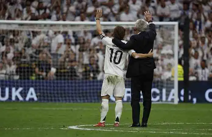Modric recibió una ovación de pie por parte del público del Bernabéu y no pudo contener las lágrimas. La multitud coreó su nombre, y algunos aficionados sostenían pancartas agradeciendo a Modric y Ancelotti.