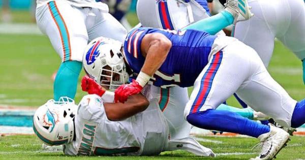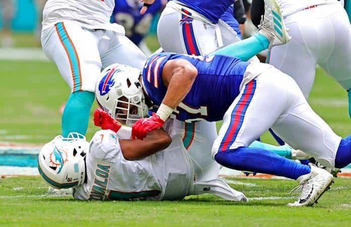 Tagovailoa duró solo dos series, eliminado del partido en una jugada fallida de cuarta oportunidad cerca del medio campo donde A.J. Epenesa superó al tackle derecho de los Dolphins, Jesse Davis, y estaba a toda velocidad cuando se lanzó hacia el mariscal de campo de Miami.