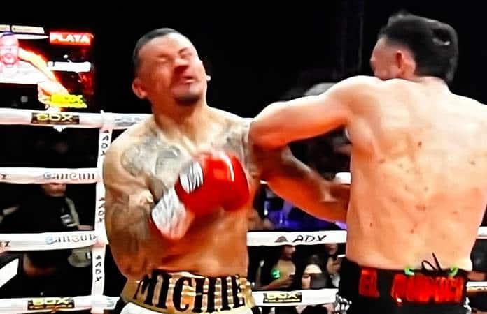 ‘Businnessman’ con un golpe directo a Michel, quien de inmediato cayó a la lona y tardó el volver a poner de pie.