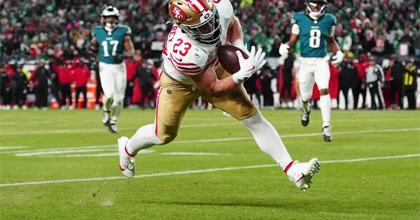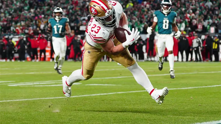 Los Eagles, que ganaron un Super Bowl con una jugada de engaño, mordieron el anzuelo con una cuando Jennings recibió el balón y rodó hacia la derecha y mandó un pase a McCaffrey para un touchdown de 29 yardas. La anotación en la primera jugada del cuarto período le dio a los 49ers una ventaja de 17-16.