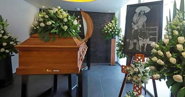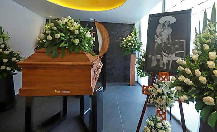 El féretro, cubierto de flores blancas, fue antecedido por una imagen del luchador en blanco y negro con su típico atuendo de botas, chaleco de piel y sombrero de charro, con un perro al lado.