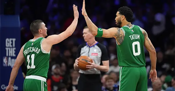 FILADELFIA.- Payton Pritchard encestó seis de los 24 triples de Boston y anotó 32 puntos, y Jayson Tatum aportó 30 unidades y 11 asistencias para ayudar a los Celtics de Boston a aguarle el regreso a Joel Embiid tras una apendicectomía y vencer 128-96 a los 76ers de Filadelfia la noche del domingo para tomar ventaja de 3-1 en su serie de primera ronda de los playoffs.
