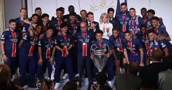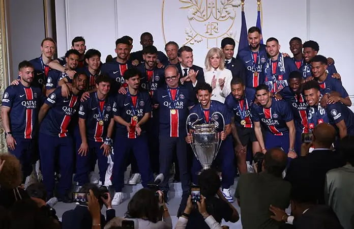 Más tarde, el equipo se reunió con el presidente francés Emmanuel Macron y la primera dama Brigitte Macron en el Palacio del Elíseo, con los jugadores vistiendo chándales del club y camisetas del PSG.