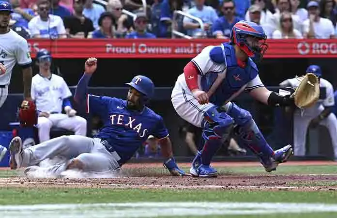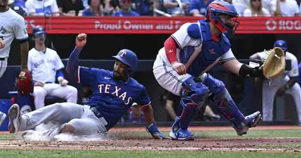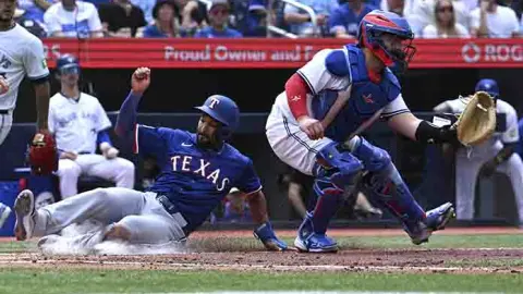 TORONTO.- Marcus Semien conectó un jonrón y anotó dos veces en su regreso a la alineación, y Nathan Eovaldi trabajó siete entradas para llevarse su séptima decisión consecutiva en la victoria del domingo 10-4 de los Rangers de Texas ante los Azulejos de Toronto para evitar perder la serie por barrida.