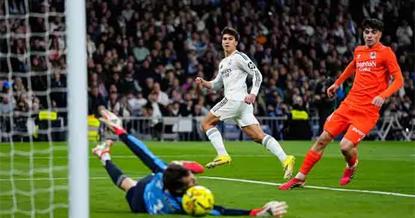 Gonzalo debió haber anotado de nuevo antes del descanso cuando Valverde lo habilitó para lo que parecía un simple empujón, pero Vinícius puso el 4-1 con su segundo penal después del descanso, señalado después de que Aramburu fuera nuevamente sancionado por derribarlo.