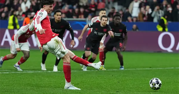 Los líderes de la Liga Premier se vieron en desventaja con el gol de Robert Andrich justo después del descanso. Pero Malik Tillman cometió una falta sobre Noni Madueke en el área, y Havertz remató rasante para batir a Janis Blaswich desde el punto penal.