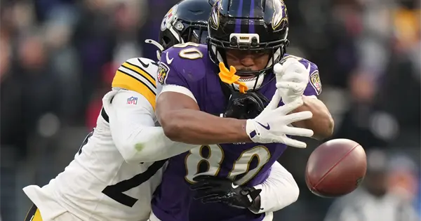 Isaiah Likely aseguró un pase de Lamar Jackson con ambas manos en la zona de anotación, y ambos pies tocaron el suelo, pero cuando estaba a punto de completar otro paso con su pie derecho, Joey Porter Jr. de los Steelers le soltó el balón. Inicialmente se marcó como touchdown, pero luego se cambió a pase incompleto. Los Ravens finalmente perdieron el balón en downs.