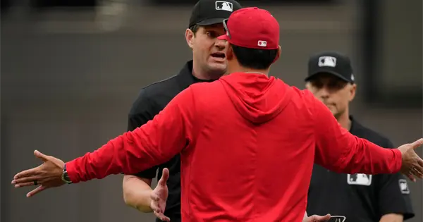 El nuevo mánager de los Angelinos, Kurt Suzuki, fue expulsado por primera vez en la octava entrada, cuando se marcó out a Logan O’Hoppe por una interferencia al no mantenerse en el carril del corredor mientras se dirigía a la primera base en un tercer strike que rebotó hacia el backstop.