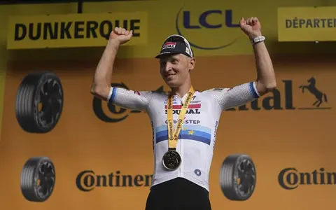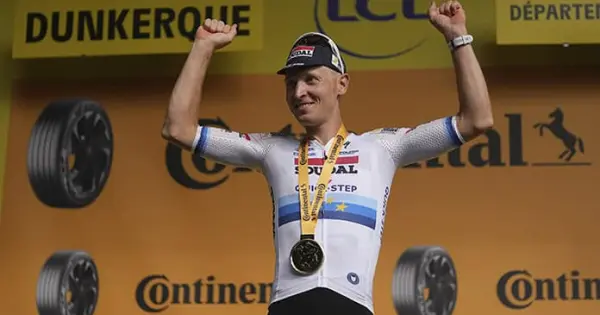 Jasper Philipsen, el ganador de la primera etapa, abandonó después de romperse una clavícula en una de las primeras caídas del recorrido.
