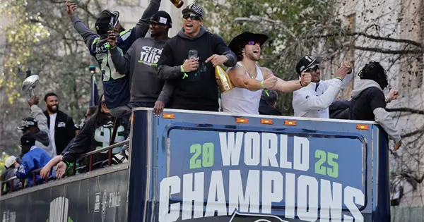 El artífice de esa defensa, el presidente de operaciones de fútbol americano John Schneider, también estaba de buen humor, con un vaso rojo de plástico en la mano, antes de que iniciara el desfile después de que los Seahawks ganaran el segundo título en sus 50 años de historia. Seattle ganó su primer campeonato hace 12 años.