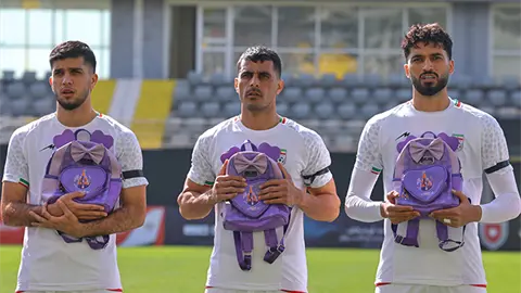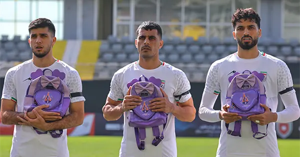 Durante el himno nacional el viernes, el equipo iraní honró la memoria de los niños asesinados al colocar pequeñas mochilas escolares rosas y moradas frente a ellos.