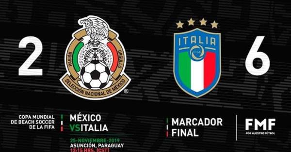 La Selección Mexicana de playa ha quedado fuera de la Copa del Mundo, ya que cayó con el representativo de Italia en su tercer partido de la competencia mundialista con un marcador de 6-2 a favor de la escuadra "azzurri". Sumando así un fracaso más para el conjunto que dirige Ramón Raya.