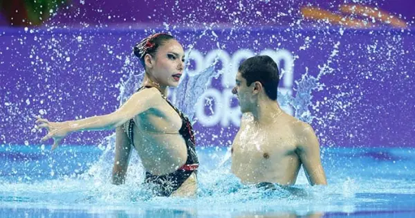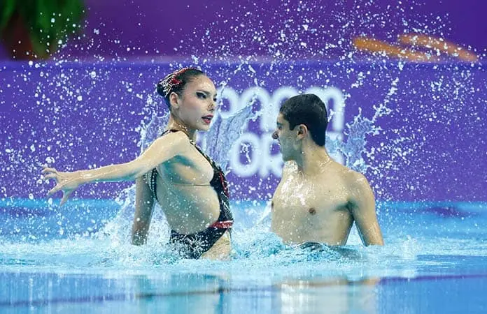 En la competencia de dueto mixto rutina técnica, que se efectuó el miércoles, los mexicanos también se colocaron en la primera posición con 217.3984 puntos, por lo que totalizaron una calificación de 530.5151 en sus dos pruebas.