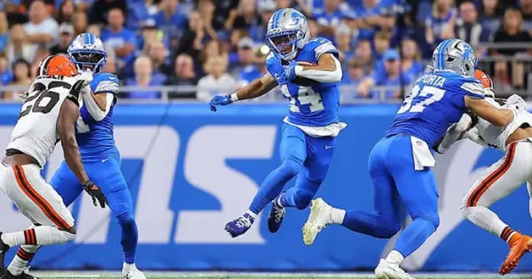 DETROIT.- Jared Goff lanzó dos pases de touchdown a Amon-Ra St. Brown, Kalif Raymond devolvió un despeje 65 yardas para otra anotación y los Lions de Detroit vencieron el domingo 34-10 a los Browns de Cleveland.