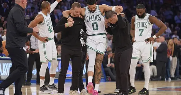 Tatum fue sacado de la cancha con 2:58 por jugar en el juego del lunes por la noche. Los Celtics acababan de perder el balón y cuando Tatum buscó uno suelto, su pierna cedió y cayó. Enterró su cara en una toalla con evidente dolor mientras se agarraba la pierna por encima del tobillo después de la lesión sin contacto.